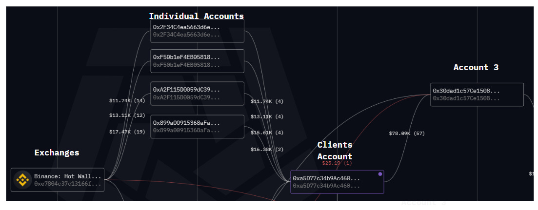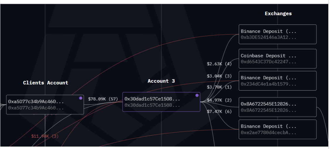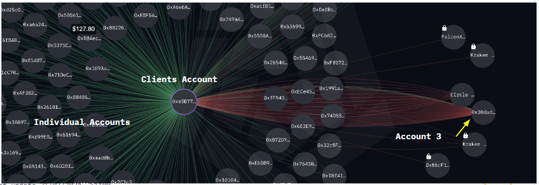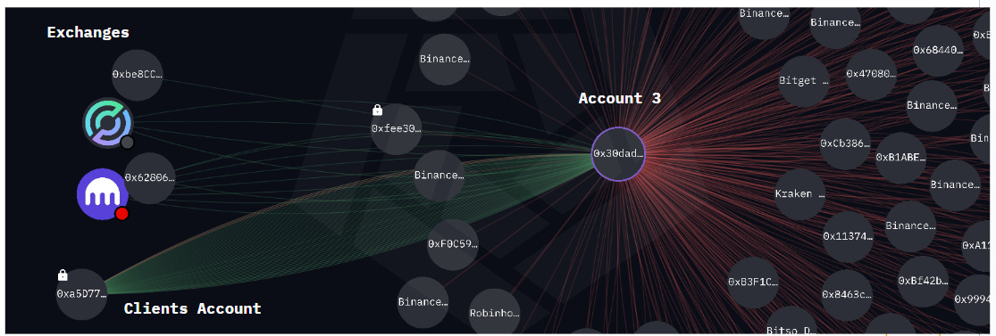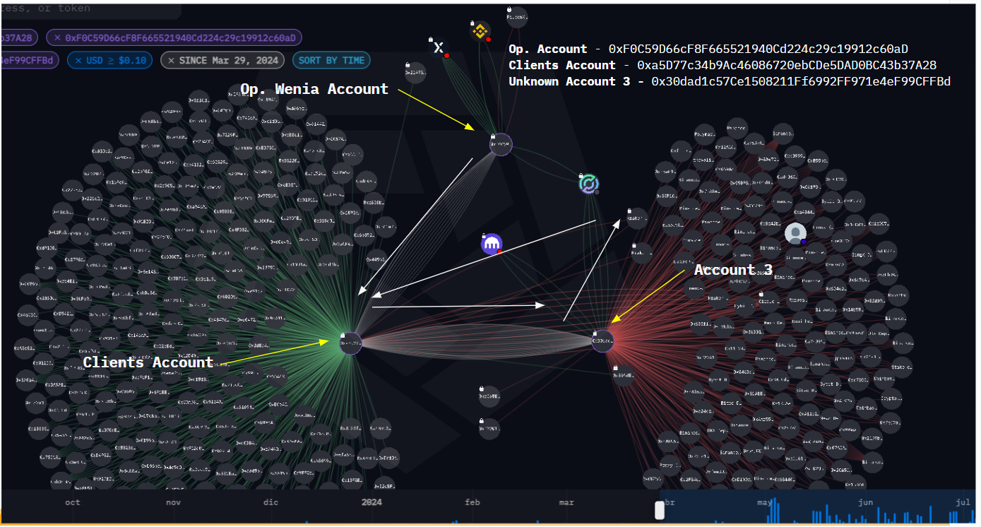 The graph reveals not only the relationships between the Operational and Clients’ accounts but also other interactions, such as inflows from exchanges to the Operational account and inflows from individual accounts to the Clients’ account. A third account stands out, let's call it Account 3 (0x30dad1c57Ce1508211Ff6992FF971e4eF99CFFB), located on the right of the graph, it interacts frequently with the Clients’ account, centralized exchanges, and individual accounts. To summarize, these are some of the most relevant interactions in terms of volume up to 22/07/2024: