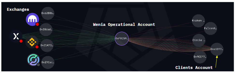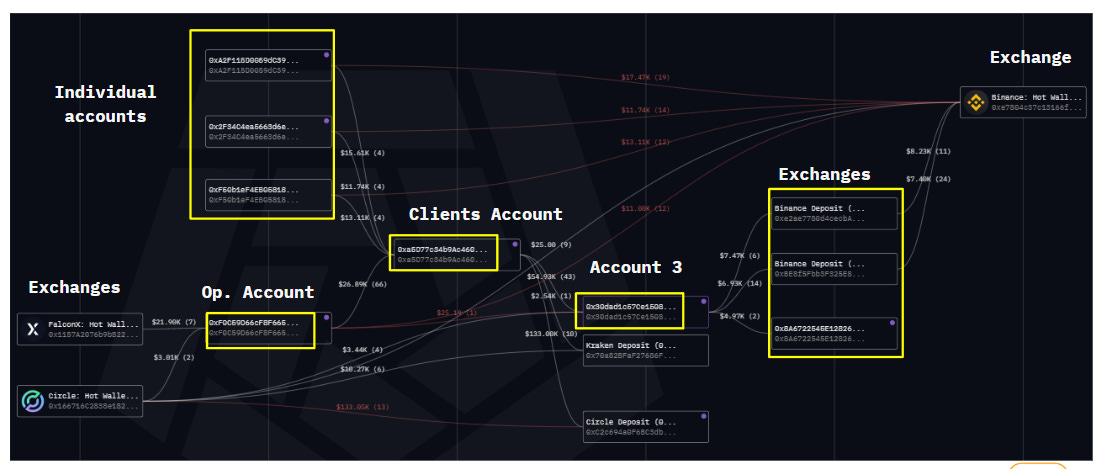 Using Arkham Intelligence, we created a graph to extract the most relevant interactions between the Operational and Clients’ accounts. The graph shows outflows and inflows in USD for USDC, USD.e, MATIC, and ETH.
