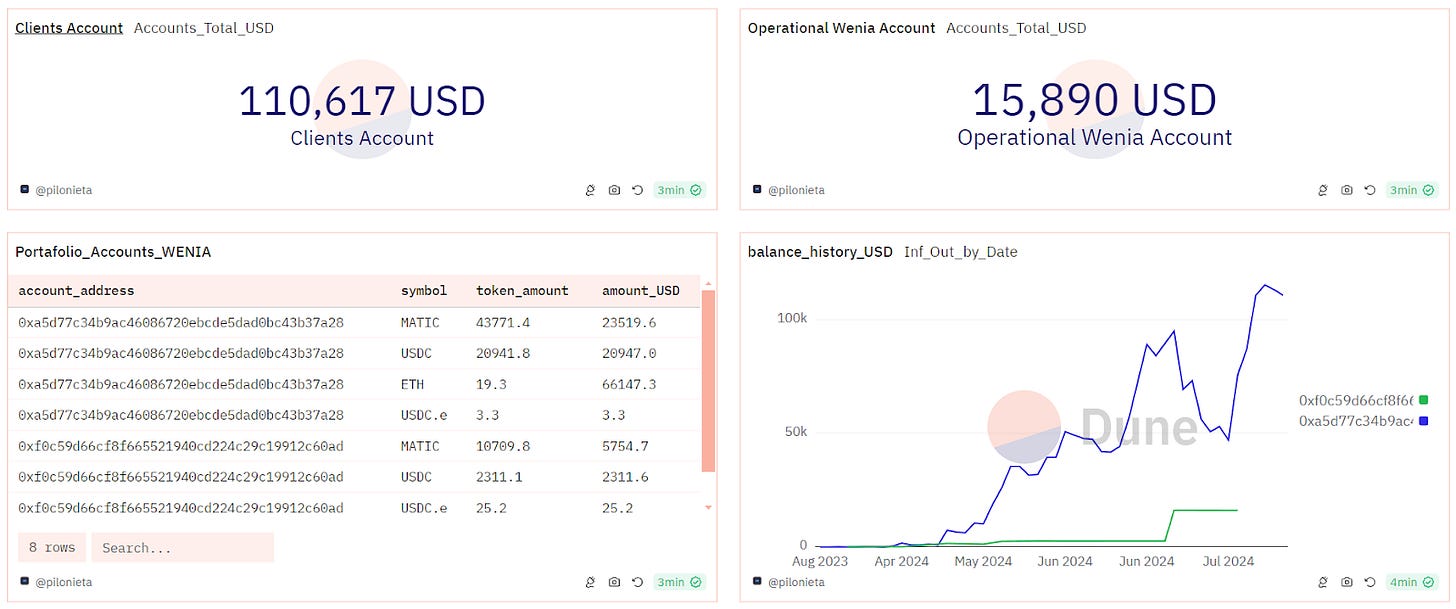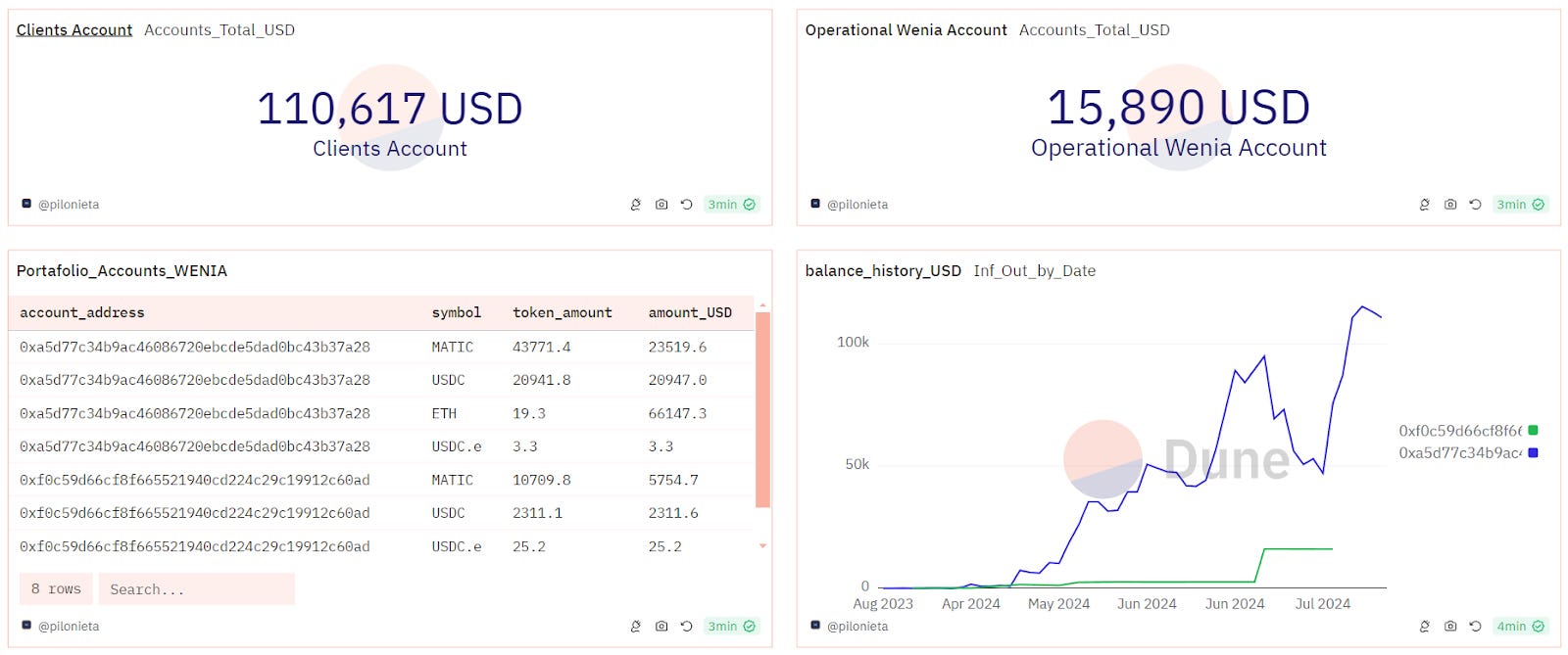 Besides the token COPW, there are other holdings in the Operational and Clients’ account. Currently, the portfolio on the Polygon network includes MATIC, USDC, and USD.e. We searched the aforemetioned account addresses on the Ethereum blockchain and found accounts with matching addresses. While this does not necessarily mean they are WENIA accounts, upon examining their interactions, we found that most interactions occur between them. This suggests that the addresses, as on the Ethereum network, correspond to the WENIA Operational and Clients’ account. You can explore further on the portafolio in my dashboard at https://dune.com/pilonieta/wenia-copw