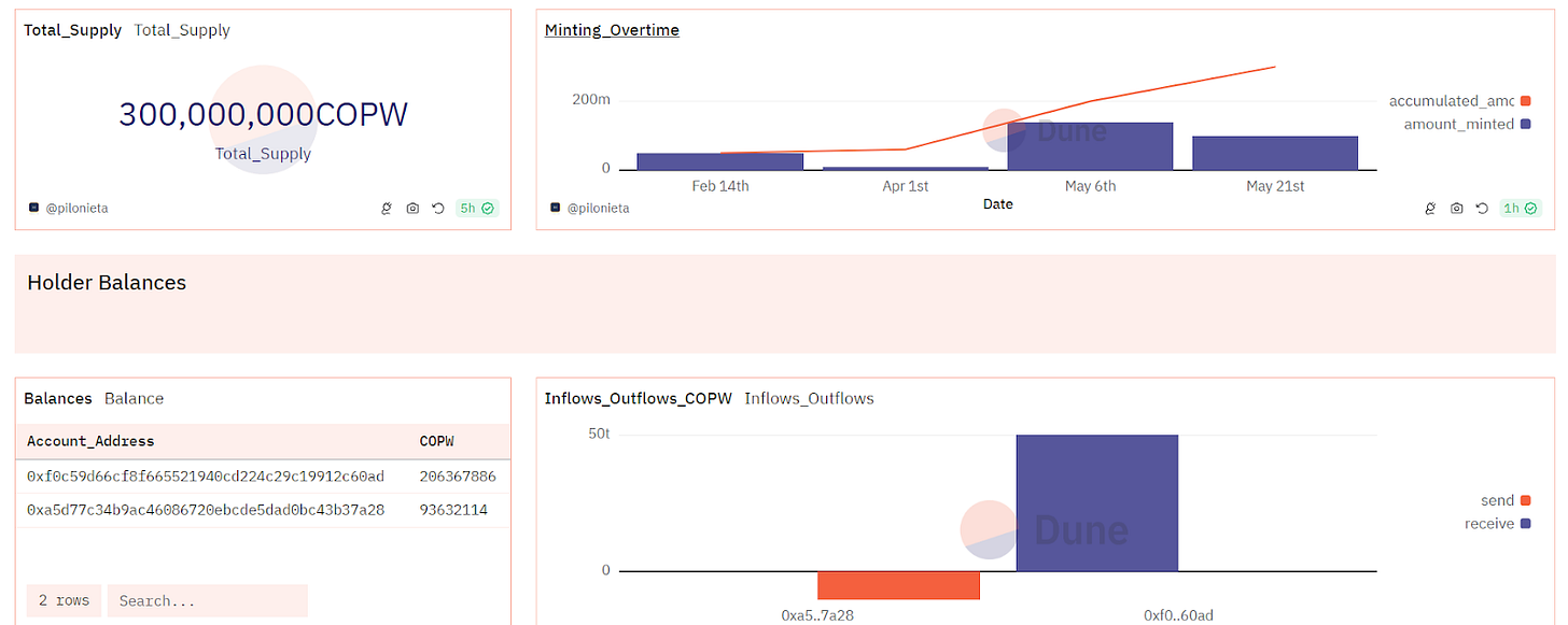 At the moment the distribution of the total supply of COPW is between WENIA’s operational account and clients’ account, 61% and 31% respectively. You can explore further in my dashboard at https://dune.com/pilonieta/wenia-copw